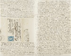 MASSENET Jules (1842-1912). — L.A.S. « Jules », Paris 2 octobre 1870, à SA FEMME, à Houlgate (Calvados) ; 2 pages in-8 sur papier fin remplies d’une petite écriture serrée, adresse avec mention « (par Ballon monté) », timbre et cachets...