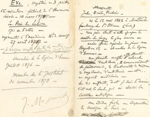 Notice autobiographique donnant des renseignements sur sa famille, ses études, ses maîtres, ses prix, et la liste d’ouvrages « composés et édités de 1868 à 1878 » ; « actuellement : professeur de composition au Conservatoire national de musique », il est membre de l’Institut depuis le 30 novembre 1878… [Vers 1907 ?], à sa femme, évoquant une séance chez Astruc avec l’auteur d’un ballet, et le vœu de Gunsbourg d’avoir cela « pour février le même soir que Thérèse »…