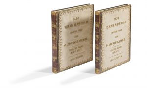 – Die Hugenotten (Les Huguenots) (Leipzig, Breitkopf & Härtel, [1836]), 1ère édition allemande, 2 volumes, 466 p., musique gravée, cotage n° 5720, paroles en allemand et français, riche reliure de l’époque demi-veau brun orné, aux plats brodés avec les titres en perles dorées. – L’Africaine (Paris, Benoit ainé, [vers 1860]), demi-maroquin (qqs ff. déreliés).