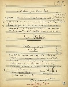 En tête de la partition, Poulenc a porté de sa main le titre Les Biches, son nom et la date « Francis Poulenc (1923) », et la mention : « Texte anglais et allemand de J. Benoist-Méchin ». Poulenc a également noté de sa main les paroles des chansons en anglais et en allemand.