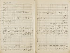 Le manuscrit de cette partition d’orchestre est à l’encre noire sur papier à 18 lignes ; il présente des grattages, des corrections et annotations au crayon ; il a servi de conducteur.
