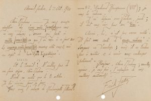 SATIE Erik (1866-1925). — L.A.S. « Erik Satie », Arcueil-Cachan 2 octobre 1920, [à CARYATHIS] ; 2 pages in-8 (2 petits trous de classeur dans le bas, sans toucher le texte ; papier légèrement jauni).