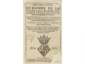 1636. (MALLORCA). THOMAS, MIGUEL: CERTAMEN POETICO, EN HONOR DE LA VENERABLE MADRE SOR CATHERINA THOMASA MALLORQUINA MONJA CANONIGA REGLAR DE SAN AGUSTIN. Barcelona: Gabriel Nogues, 1636. 8° mayor. 8 h. + 153 fol., 1 h. Texto enmarcado. Grabados en...