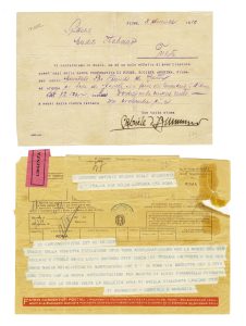 La raccolta comprende: 3 lettere su carta intestata 'Città di Fiume / Comando', 1 documento con intestazione 'Comitato napoletano pro bimbe fiumane', 1 invito al Teatro alla Scala per la manifestazione pro Fiume e Dalmazia Italiana (1919), 1 busta con annotazione autografa di D'Annunzio, 3 telegrammi (1 con firma autografa di D'Annunzio), 1 appunto autografo di D'Annunzio. Insieme anche alcune cartoline più recenti di argomento d'annunziano e alcuni francobolli. (12)