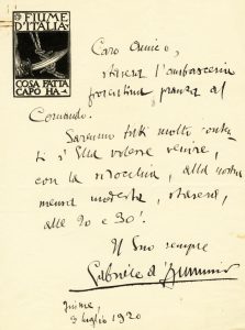 D'Annunzio Gabriele, Lettera autografa firmata inviata a Riccardo Gigante, podestà di Fiume. Datata 3 luglio 1920