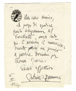 D'Annunzio Gabriele, Lettera autografa firmata inviata al Comm. Giovanni Rizzo insieme al testo del telegramma inviato a Mussolini. Datata 16 marzo 1924