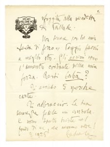 Manoscritto a inchiostro nero. 2 carte scritte al recto. Con intestazione 'Io ho / quel che ho / donato'. Busta conservata. Dimensioni: 330x245 mm. SI AGGIUNGE: Hardouin D'Annunzio Maria. Lettera autografa firmata inviata al Comm. Cosentino, Ministero di Grazia e Giustizia. Datata 17 febbraio 1939 (2)