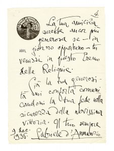 D'Annunzio Gabriele, Lettera autografa firmata inviata ad Achille Starace. Datata 9 dicembre 1935