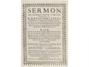 1711. (MALLORCA). RISSON, MARIANO MAURO: SERMON DEL GLORIOSO MARTIR Y DOCTOR ILUMINADO EL B. RAYMUNDO LULIO, PREDICADO EN LA IMPERIAL UNIVERSIDD LULIANA, EL DIA DE LA CONVERSIÓN DE S. PABLO, EN EL R. CONVENTO DE S. FRANCISCO, ASISTIENDO EL...