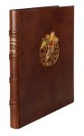 In-folio (mm 575x440). Carte [1] bianca, [12], [1] bianca con 8 acqueforti originali fuori testo, con firma a secco di Michele Cascella in basso a destra, e una suite delle incisioni pastellate a mano, numerate a matita in basso a sinistra e firmate in basso a destra dall'Artista. Marginoso esemplare, perfettamente conservato. Il tutto entro bella custodia editoriale in piena pelle marrone, con titoli dorati impressi al dorso a 4 nervi, e bel motivo ornamentale a colori con motto impressi incisi in oro al piatto anteriore. Copia n. 4 di una tiratura complessiva di 171 esemplari, uno dei 100 contrassegnati con numeri arabi.