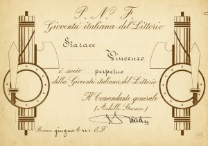 Al cartoncino, mai giocato, è allegata una velina del Capo dell'Ufficio della Propaganda che spiega il fine di questo gioco destinato esclusivamente ai 'militari degenti negli Ospedali Militari'. Dimensioni: 320x570 mm. SI AGGIUNGONO: 1 attestato con intestazione "Gioventù Italiana del Littorio" con firma autografa di Achille Starace, 1 testo a stampa che contiene un discorso di Mussolini e 4 esemplari del manifesto propagandistico dal titolo "Pax Britannica" realizzato da Giulio Bertoletti nel 1943 con una caricatura di John Bull, personificazione dell'Inghilterra che cammina sopra alcuni cadaveri. (7)