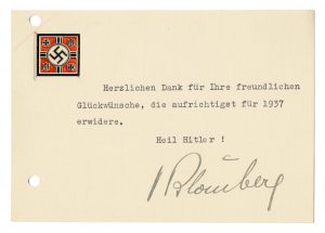 Blomberg Werner von, Cartoncino dattiloscritto con firma autografa. Non datato ma gennaio 1937.