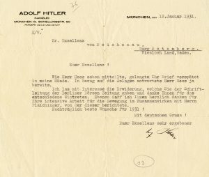 Hitler Adolf, Lettera dattiloscritta con firma autografa inviata a 'Sr. Exzellenz von Reichenau, Burg Rotenberg. Wiesloch Land, Baden'. Datata 12 gennaio 1931, Monaco.