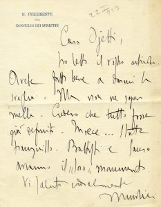 Manoscritto a inchiostro nero. 1 bifolio, scritta 1 pagina. Su carta intestata 'Il Presidente / del / Consiglio dei Ministri'. Busta conservata. Dimensioni: 220x170 mm. SI AGGIUNGE: Testo di telegramma a firma del generale Pecori Giraldi inviato alla vedova di Cesare Battisti, insieme a 1 fotografia di Cesare Battisti, 1 fotografia di Cesare Battisti e Fabio Filzi e 1 fotografia di Battisti dopo la condanna. SI AGGIUNGONO: Battisti Ermete. 5 lunghe lettere autografe firmate scritte dalla vedova di Battisti a Ugo Ojetti. Datate anni '20. Carte da studiare. (10)