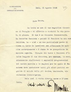 Mussolini Benito, Lettera dattiloscritta con annotazione e firma autografa inviata ad Alfredo Rocco. Datata 31 agosto 1925, Roma.