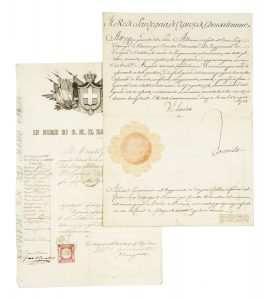 Manoscritti a inchiostro nero. Alcuni sigilli in carta conservati. 1 documento con mancanza di carta e parziale (piccola) perdita di testo. Dimensioni varie. SI AGGIUNGONO: 7 documenti (manoscritti e a stampa) con intestazioni 'Vittorio Emanuele II', 'Vittorio Emanuele III', 'Umberto I'. 2 con firme autografe di Agostino De Pretis, Urbano Rattazzi. SI AGGIUNGE: 1 passaporto del Regno di Sardegna. Datato 1860. (16)