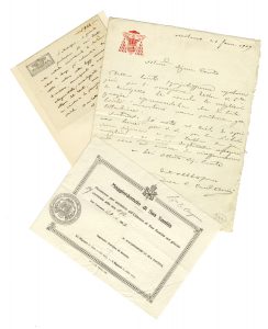 Raccolta di circa 100 tra pergamene, lettere, cartoline e biglietti autografi di scienziati, religiosi e imprenditori. XVIII-XX secolo.
