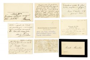Raccolta di oltre 70 biglietti da visita, alcuni con annotazioni autografe. Fine XIX – inizio XX secolo.