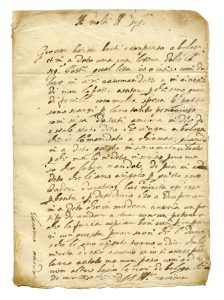 Manoscritto a inchiostro bruno. Un bifolio, scritta una pagina. Al verso della seconda carta indicazione dei destinatari e sigillo in carta. Pieghe di spedizione. Carta con filigrana. Dimensioni 160x190 mm.