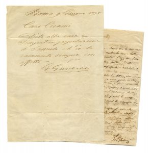 Manoscritto a inchiostro bruno. 1 bifolio (le due pagine staccate tra loro). Scritta 1 pagina. Al verso della seconda carta il nome del destinatario. Dimensioni: 260x185 mm. SI AGGIUNGE: Fabrizi Nicola (generale garibaldino). Lettera autografa firmata inviata a Felice Spezzani. Datata 9 giugno 1875, Roma. (2)