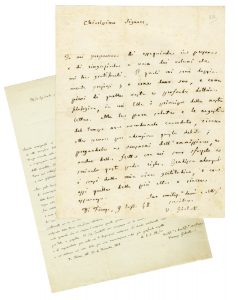 Manoscritto a inchiostro nero. 1 bifolio, scritta 1 pagina. Al verso della seconda carta il nome del destinatario. Dimensioni: 247x192 mm. SI AGGIUNGONO: Id.: 2 lettere autografe inviate a Vincenzo Nannucci e al pittore Fichter. Solo 1 datata 1848. (3)