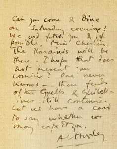 Huxley Aldous, Breve lettera autografa firmata. Non datata.