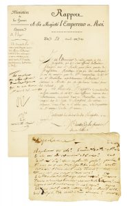 Documento a stampa e manoscritto. 1 carta scritta al recto. Con intestazione 'Ministère / de / la Guerre / Rapport / a Sa Majesté l'Empereur et Roi'. Documento firmato anche dal Duca di Feltre, Ministro della Guerra. Dimensioni: 310x208 mm. SI AGGIUNGE: 1 foglio manoscritto dal titolo: 'Napoleone'. Non datato, ma inizio XIX secolo. (2)