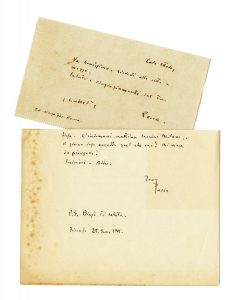 Manoscritto a inchiostro nero. 1 bifolio, scritte 2 pagine. Su carta con intestazione 'Hotel Helvetia / Florence'. Fori di classificatore. Dimensioni: 220x140 mm. SI AGGIUNGE: Id.: 1 cartolina autografa firmata inviata allo scultore Ettore Fassari. Datata 26 marzo 1907. (2)