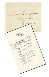 Manoscritto a inchiostro nero su carta listata a lutto. 1 bifolio, scritta 1 pagina. Su carta intestata del poeta 'Aldworth Halsemere Surrey', sua residenza. Dimensioni: 175x115 mm.