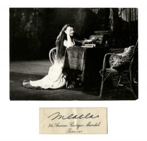 La fotografia, in formato 105x145 mm reca al verso la stampigliatura: Copyright by E. Piccagliani Teatro alla Scala. SI AGGIUNGE: Id.: Ritaglio di busta intestata, incollato su cartoncino, con l'indirizzo parigino della Callas: 36, Avenue Georges Mandel Paris 16e e la firma autografa a inchiostro nero MCallas,. Dimensioni 29x76 mm (2)