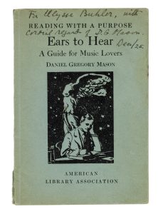 Manoscritto a inchiostro nero. Dedica sulla brossura del libro di Daniel Gregory Mason Ears to Hear A guide to Music Lovers (Chicago, American Library Association 1925). Dimensioni: 175x120 mm.