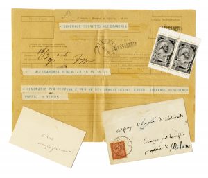 Manoscritto a inchiostro nero. Busta conservata con il nome del destinatario (autografo di Verdi) 'Alfonso Visconti di Salicato / Cernusco sul Naviglio / provincia di Milano'. Dimensioni: 53x90 mm. SI AGGIUNGONO: Id.: 1 telegramma a stampa inviato al generale Corvetto ad Alessandria e 4 francobolli con l'effige del compositore del 1913. (2)
