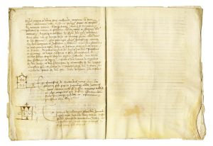 Manoscritto pergamenaceo a inchiostro bruno. 6 fogli. Tarda gotica con abbreviazioni. Con signa tabellionis. Brossura in carta dell'epoca. Dimensioni: 200x147 mm.