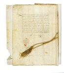 Manoscritto pergamenaceo a inchiostro marrone scuro. Pagine 14 (scritte) e 3 fogli bianchi legati tra loro da antico spago in filo di seta a vari colori. Pergamena conservata arrotolata con qualche segno del tempo al foglio pergamenaceo protettivo. Dimensioni: 330x250 mm.