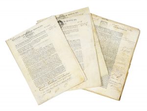 Documenti a stampa e manoscritti pergamenacei in lingua francese. 16 fogli in totale. cinque datati 1715- 1716 e quattro 1764. Timbri notarili di Parigi. Un documento è mancante di parte del secondo folio, per il resto conservazione molto buona. Dimensioni 330x240 mm. (8)
