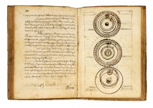 Manoscritto cartaceo a inchiostro bruno. Pagine [6], 305, [5] con due errori di numerazione. Rigatura a secco per il testo. Diagrammi e figure disegnate su alcune pagine. Note di appartenenza del canonico Antonio Mainenti. Legatura pergamenacea coeva. Dimensioni: 195x135 mm.