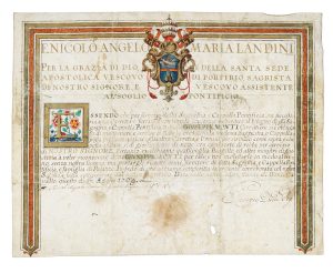 Manoscritto pergamenaceo. Testo in italiano. Foglio con intestazione 'F. Nicolò Angelo Maria Landini [...] vescovo di Porfirio [...] e Vescovo assistente al Soglio Pontificio', con stemma e margini decorati a vari colori. In fine la firma di Niccolò Angiolo Maria Vescovo di Porfirio [Porfireone, antica città da Haifa e Acri oggi in Israele]. Dimensioni: 350x445 mm.