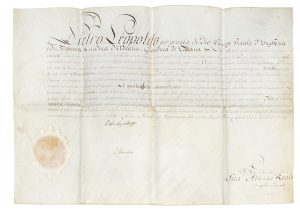 Manoscritto pergamenaceo a inchiostro bruno. Con intestazione 'Pietro Leopoldo'. Testo in italiano. Oltre alla firma autografa del Granduca di Toscana, anche quella del principe Francesco Orsini von Rosenberg. Sigillo in carta conservato. Documento in più che buono stato. Dimensioni: 420x610 mm.