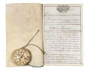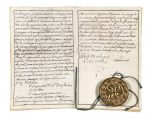 Manoscritto pergamenaceo a inchiostro bruno. 6 fogli. Spago originale e sigillo in ceralacca conservato. In testa al primo foglio, stampigliatura uso bollo. Dimensioni: 285x182 mm.