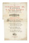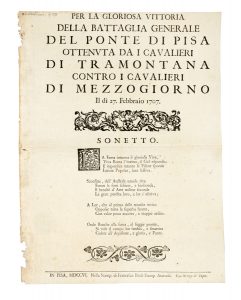 Foglio a stampa. mm 355x270. Una piega centrale, buono stato complessivo. SI AGGIUNGONO: Per la vittoria del ponte gloriosamente riportata da' cavalieri di Tramontana contro quelli di Mezzogiorno il dì 24 febbraio 1726. In Pisa: per Gio. Dom. Carotti, 1726. Foglio a stampa. mm 425x285. Piega centrale. Alle altezze reali di Ferdinando III d'Austria e Luisa Maria di Borbone suoi desideratissimi sovrani la comunità e popolo sanese sonetto. In Siena: dai torchj Pazzini Carli, 1791. Foglio a stampa impresso in rosso e nero. mm 610x375. Foglio gorato, più volte ripiegato. (3)