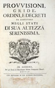 Provvisioni, gride, ordini, e decreti da osservarsi negli Stati di Sua Altezza Serenissima. Modena: per gli eredi di Bartolomeo Soliani stampatori ducali, 1755.