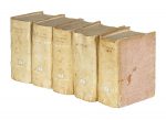3 volumi in-4° (mm 245x175). Pagine [174], [2] bianche, 1509, [1] con 1 tavola ripiegata fuori testo; [64], 1388 + 1 tavola ripiegata fuori testo; [88], 1326, [2] bianche + 1 tavola ripiegata fuori testo. Marca editoriale incisa in legno a ciascun frontespizio, con testo stampato in rosso e nero; numerosi capilettera xilografici nel testo. Frontespizi rinforzati, parzialmente mancante il margine esterno delle prime due pagine di indice del primo volume e numerose pecette di rinforzo. Esemplare parzialmente brunito, con fori di tarlo, macchie, aloni di umidità e strappi anche alle tavole. Mancante una tavola al primo volume. Legatura in mezza pergamena con punte e piatti in carta decorata; macchie, abrasioni e lievi mancanze alle punte e alle unghiature. SI AGGIUNGE: Silva Feliciano (da), Institutiones Divi Caesaris Iustiniani... Venetijs: S.e., 1569. In-4° (mm 245x175). Pagine [38], [2] bianche, 383. Frontespizio in rosso e nero, con marca editoriale incisa in legno, e numerosi capilettera xilografici nel testo. Testo stampato in rosso e nero, su due colonne; frontespizio rinforzato, mancanze marginali ad alcune pagine e aloni di umidità. Esemplare scompleto della tavola fuori testo. UNITO CON: Novellae constitutiones Divi Caesaris Iustiniani... Venetiis: S.e., S.a. [i.e. Bevilacqua Niccolò, 1569]. Pagine [20], 352, 226, [2] bianche, [14], 15-145. Frontespizio in rosso e nero, con marca editoriale xilografica. Esemplare lievemente brunito, con mancanze marginali ad alcune carte e ampie gore sparse. Restauro all'ultima carta e purtroppo mancanti le pagine 353-359. Legatura in mezza pergamena con punte e piatti in carta decorata; titoli manoscritti al dorso. Macchie ai piatti, difetti agli angoli e internamente un po' allentata. SI AGGIUNGE: Pico della Mirandola Giovanni, Codicis Iustinianei, Constitutiones Imperiales complectentis, libri IX [...] Editio postrema. Venetiis: apud Nicolaum Bevilaqua, 1569. In-4° (mm 245x175). Pagine [48], 1486 [i.e. 1488], [26] + 3 tavole ripiegate fuori testo. Marca editoriale incisa in legno al frontespizio. Esemplare brunito, con macchie, gore, strappi e mancanze ad alcune pagine; frontespizio rinforzato. Purtroppo mancanti 4 pagine di indice e le ultime 2 pagine, presumibilmente bianche. Legatura in mezza pergamena con punte e piatti in carta decorata; titoli manoscritti al dorso. Macchie ai piatti e difetti alle unghiature. (5)