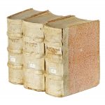 2 volumi in-4° (mm 240x170). Pagine [88], 1020; [4], 1021-1904, [28], 130, [4], 56 [i.e. 58], [2] bianche, [8], Carte 180. Frontespizio stampato in rosso e nero, con il ritratto calcografico di Papa Paolo V, al primo volume; marca tipografica incisa in legno al frontespizio di ciascuna delle quattro parti che compongono il secondo volume. Numerosi capilettera xilografici nel testo. Macchie, aloni di umidità, forellini di tarlo e strappi marginali, con le pagine 1135-1136 del secondo volume maldestramente restaurate; altrimenti buon esemplare. Legatura in mezza pergamena, con piatti in carta decorata e titoli manoscritti al dorso a 3 nervi. Abrasioni e mancanze ai piatti e al dorso. SI AGGIUNGE: Liber sextus Decretalium... Venetiis: apud socios Aquilae renouantis, 1605. 5 parti in 1 volume in-4° (mm 235x170). Pagine [8], 592, 243, [5], 262, [2] bianche, [32], 62, 30, [2] bianche, [4]. Ciascuna parte dotata di un proprio frontespizio: il ritratto di Paolo V inciso in rame per la prima; una vignetta xilografica con Gregorio XIII per la seconda e la terza, e la marca tipografica incisa in legno al frontespizio della quarta e quinta parte. Fregi xilografici nel testo. Esemplare parzialmente gorato, con macchie in alcune parti e il margine inferiore del frontespizio della prima parte maldestramente ricostruito. Legatura in mezza pergamena, con piatti in carta decorata e titoli manoscritti al dorso a 3 nervi. Abrasioni e lievi mancanze, con i piatti staccati nella parte superiore. (3)