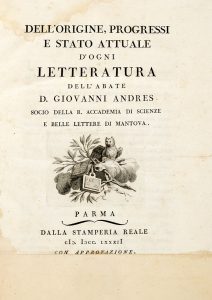 Andres Juan, Dell'origine, progressi e stato attuale d'ogni letteratura [...]. Tomo primo [- settimo]. Parma: dalla Stamperia Reale, 1782-1799.