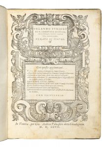 Ariosto Ludovico, Orlando furioso [...] con cinque nuovi canti del medesimo. Ornato di figure... In Venetia: per Gio. Andrea Valvassori detto Guadagnino, 1567.