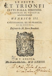 In-4° (mm 202x142). Carte 10. Marca tipografica incisa in legno al frontespizio, e fregi xilografici nel testo. Forellini centrali alle prime 5 carte e aloni di umidità marginali. SEGUITO DA: Murtola Gasparo, Epithalamio [...] nelle feliciss. Nozze de le Maestà Christianissime Henrico IIII et Maria de Medici... In Roma: appresso Nicolò Mutio, 1600. Carte [5], [1] bianca. Esemplare rifilato, con alcune carte leggermente allentate. Di Capua Annibale, [...] archiepiscopi neapolitani sanctissimi d. Sixti V Summi Pont. Nuntii habita ad illustrissimum senatum Regni Poloniae, & magni Ducatus Lithuaniae pro nova regis electione. Romae: apud Titum, e Paulum Dianos fratres, 1587. Carte [4]. Stemma papale xilografico al frontespizio, capolettera e finalino in rame nel testo. Una macchia al frontespizio e lievi fioriture sparse nel testo. Boccapaduli Antonio, Oratio in translationem Pii V... Romae: ex officina Marc'Antonii Muretti, 1588. Carte [4]. Marca xilografica al frontespizio. Aloni marginali a tutte le carte, e fioriture sparse. Id., De Pontifice Max. declarando... Romae: ex officina Marcantonii Muretti, 1590. Carte [6]. Copia leggermente rifilata ai margini esterni, con la stessa marca al frontespizio dell'opera precedente e fregi xilografici nel testo. Bressieu Maurice, [...] Oratio, ad Sixtum V Pont. Opt. Max... Romae: apud Heredes Iaon. Osmarini Gilioti, s.d. [i.e. 1586 ca.]. Carte [6]. Buone condizioni. Id., [...] Oratio ad S.D.N. Clementem VIII Pont. opt. Max pro Errico IIII... Romae: Apud Aloysium Zanettum, 1597. Pagine 16. Stemma calcografico di Clemente VIII e Enrico IV entro cornice al frontespizio; graziosi fregi a mo' di testatine, capilettera e finalini nel testo. Una macchia all'ultima carta, altrimenti ottime condizioni. Picca Gregorio, Oratio ad Sixtum V Pont. max. pro Gallorum pace componenda... Romae: ex typographia Bartholomaei Bonfadini, 1588. Carte [8]. Stemma di Sisto V inciso in legno al frontespizio e altri, graziosi fregi nel testo. Ben conservato, ad eccezione di rare macchioline nel testo. Pellegrini Lelio, Ad Clementem VIII [...] oratio [...] in sacro consistorio habita cum vir illustriss... Romae: apud heredes Ioannis Liliotti, 1593. Carte [4]. Esemplare lievemente brunito, con stemma di Clemente VIII inciso in legno al frontespizio. Id., [...] Oratio in obitum Torquati Tassi... Romae: Apud Guglielmum Facciottum, 1597. Pagine 23, [1] bianca. Ritratto calcografico del Tasso entro ovale in cornice al frontespizio. Lievi fioriture, altrimenti ottime condizioni. Muret Marc Antoine, Oratio habita Romae in funere Karoli IX Gallorum Regis. Romae: apud Haeredes Antonii Blandii Impressores Camerales, 1574. Carte [6]. Marca xilografica al frontespizio e fregi nel testo. Alone di umidità al margine inferiore e sporadiche fioriture, ma buone condizioni. Panigarola Francesco, Ragionamento [...]. In occasione di essequie, che all'illustriss. Cardinale Santa Prassede, alcuni mesi doppo la morte di lui... In Roma: per Francesco Zanetti, s.d. [i.e. 1585]. Pagine 15, [1]. Marca in legno al frontespizio; testatina e capilettera nel testo. Lievi fioriture, altrimenti ottime condizioni. Cesarini Gabriele, Oratione funebre [...] fatta per l'essequie del serenissimo Alessandro Farnese romano... In Roma: appresso Antonio Zannetti, 1593. Carte [8]. Stemma xilografico al frontespizio. Lievi fioriture. Id., Oratio funebris [...] ab eo Romae habita, dum in templo Araecoeli Alexandro Farnesio Romano Parmae et Placentiae duci III... Romae: apud Antonium Zannettum, 1593. Carte [8]. Stemma di Farnese inciso in legno al frontespizio. Esemplare ad ampi margini, ben conservato. In funere Laurentii Cagnati adolescentis Romani philosophiae, ac medicinae doctoris... Romae : apud Aloysium Zannettum, 1602. Pagine 19, [1] bianca. Marca xilografica al frontespizio e capilettera in legno nel testo. Buona copia, lievemente rifilata al margine esterno di alcune pagine. Zaratino Castellini Giovanni, In funere Io. Francisci Aldobrandini... Romae: apud Carolum Vulliettum, 1602. Carte [4]. Stemma del dedicatario impresso in legno al frontespizio e un ovale con ritratto al verso della carta A2. Buona copia, leggermente corta al margine inferiore. Relazione della rotta data dal Serenissimo Duca di Lorena all'esercito de' raitri et lanzchenetti... In Roma: aprresso Bartolomeo Bonfandino, 1590. Carte [4]. Piccoli aloni di umidità al margine esterno delle carte, altrimenti ottime condizioni. Oratione fatta dal Re Henrico III di Francia et Polonia nell'apertura dell'assemblea delli tre Stati Generali... In Roma: Per Tito et Paolo Diani, Fratelli, 1588. Carte [8]. Stemma xilografico di Enrico III al frontespizio. Fioriture, ma complessivamente buon esemplare. Leblanc Guillaume, De morte Annae ducis de Gioiosa Paris et amiralii Franciae [...] Elegia consolatoria... Romae: ex typographia Titi & Pauli de Dianis fratrum, 1587. Carte [5], [1] bianca. Bello stemma calcografico al frontespizio. Copia fortemente rifilata, con perdite di testo al margine inferiore e laterale. Bellarmino Roberto, Aviso alli sudditi del dominio venetiano [...]. Sopra d'una lettera di frate Gio. Battista Palmieri... In Roma: appresso Guglielmo Facciotto, 1607. Pagine 12. Vignette xilografica dei santi Pietro e Paolo al frontespizio. Ottime condizioni. Complessivamente miscellanea ben conservata, con legatura in pergamena floscia coeva, con titolo manoscritto e fregi manoscritti al dorso. Macchiette ai piatti e lievi mancanze al dorso.