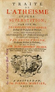 Buddeus Johann Franz, Traité de l'athéisme et de la superstition. A Amsterdam: chez Pierre Mortier, 1740.