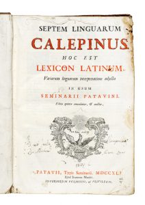 Calepino Ambrogio, Septem linguarum Calepinus. Hoc est lexicon Latinum, variarum linguarum interpretatione adjecta... Patavii: typis Seminarii apud Joannem Manfrè, 1741.