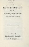 In-12° (mm 205x145). Pagine 40. Fregio xilografico al frontespizio. Brossura editoriale originale molto fragile e parzialmente staccata. SI AGGIUNGE: La constitution de la Republique Française une et indivisible. Paris: De L'Imprimérie Nationale l'an. III (1795). In-12° (mm 202x140). Pagine 56. Lavoro di tarlo nelle prime 6 carte di testo. Legatura moderna in brossura muta. (2)