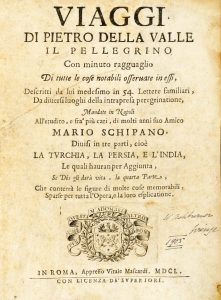 Della Valle Pietro, Viaggi [...] con minuto ragguaglio di tutte le cose notabili osservate in essi... In Roma: appresso Vitale Mascardi, 1650-1663.